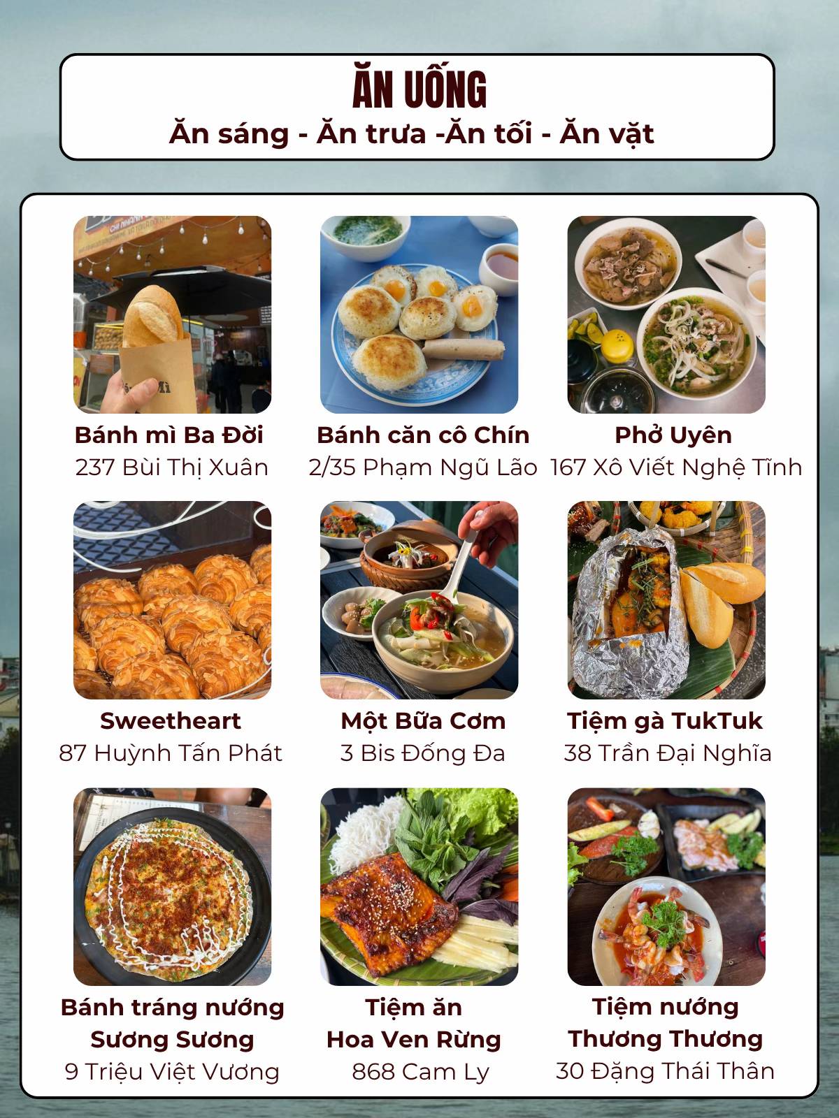👉 Bánh mì Ba Đợi, bánh căn cô Chín, phở Uyên, nui cô Xuân.