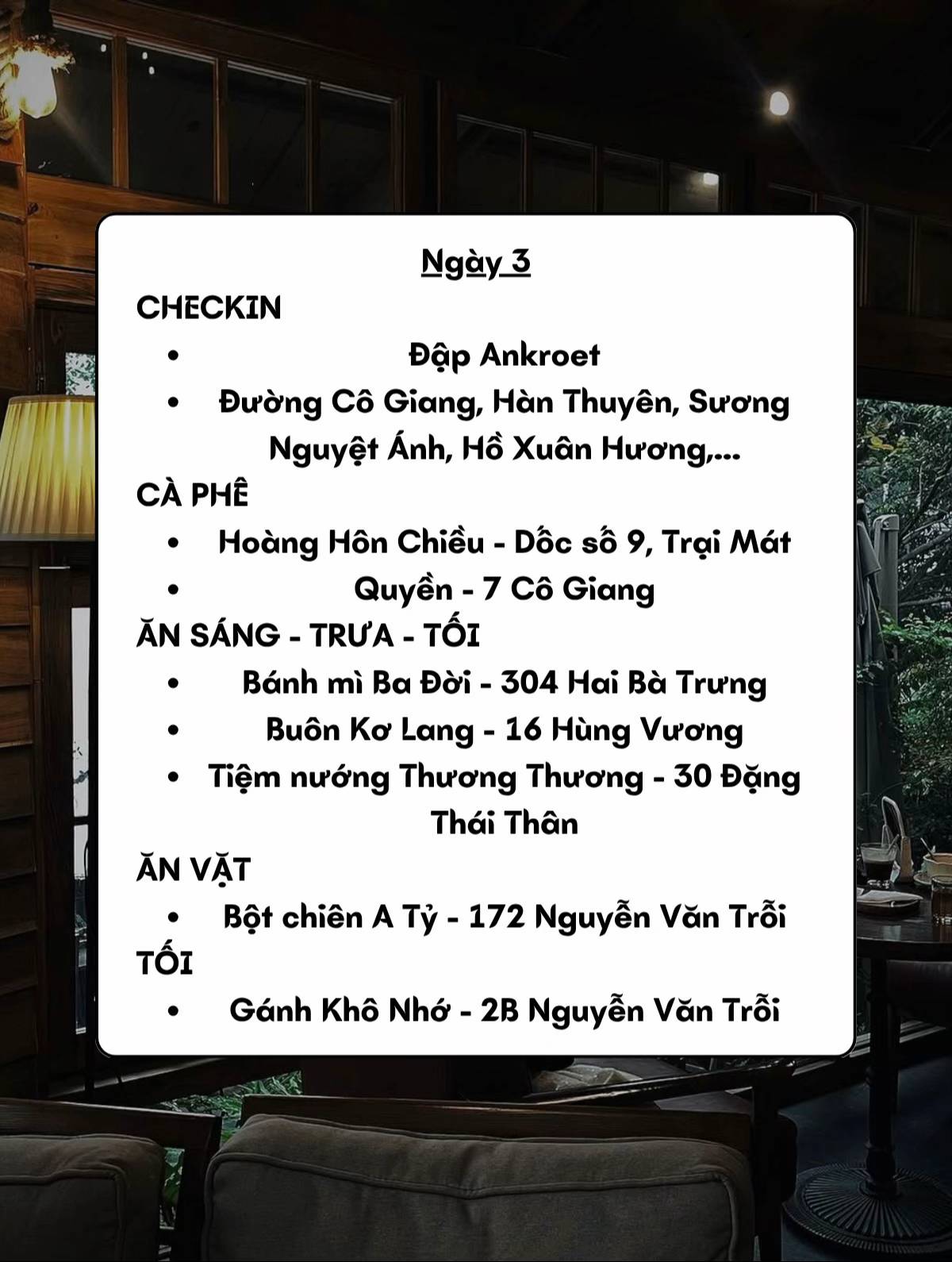 Bữa tối: Dành thời gian cho tiệm nướng Thương Thương (30 Đặng Thái Thân) – quán nướng siêu đông khách. Buổi tối, bạn có thể chill nhẹ ở Tagspace (Hẻm 15 Lương Thế Vinh) hoặc mua đặc sản ở Minh Tiến Farm (157 Huyền Trân Công Chúa).