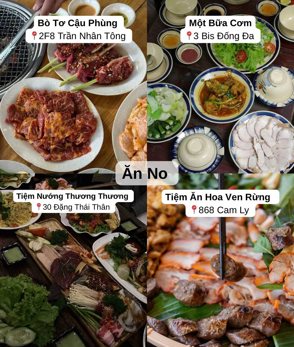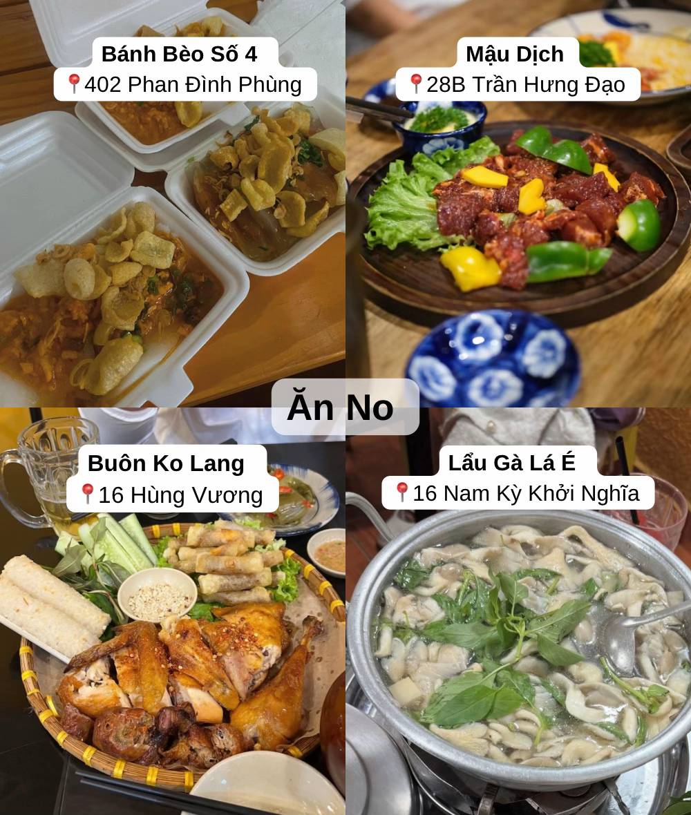 → Bạn nhất định phải thử bánh ướt lòng gà, nem nướng, lẩu gà lá é và bánh mì xíu mại.
