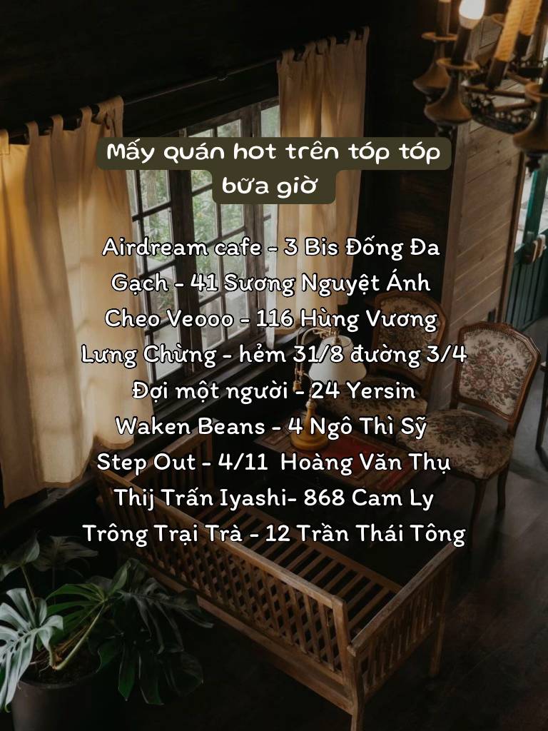 Bạn có thể thử Đợi Một Người, Lung Chừng hoặc Hoàng Hôn Chiều – những quán cà phê có view đẹp và nổi tiếng trên mạng xã hội.