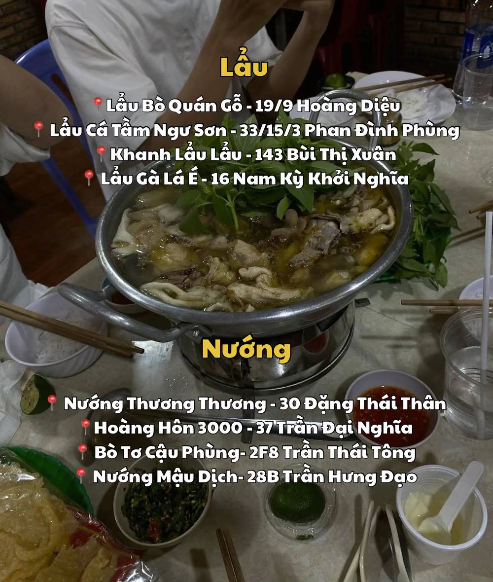 👉 Bạn có thể thử lẩu gà lá é, lẩu bò quán gỗ hoặc các quán nướng như Thương Thương, Hoàng Hôn 3000.