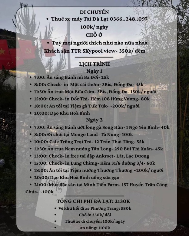 • Di chuyển: Thuê xe máy tại Tài Đà Lạt (0366.xxx.xxx), giá 100k/ngày, thuận tiện để đi ăn uống và tham quan.