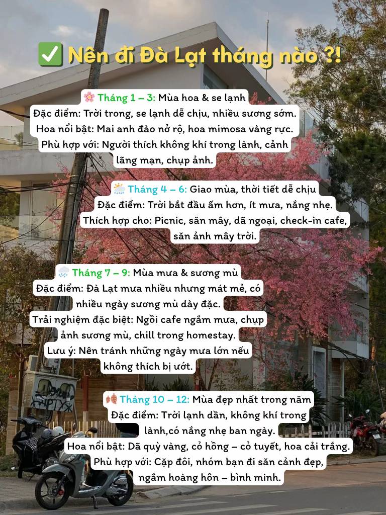Một chuyến đi Đà Lạt sẽ không trọn vẹn nếu bạn chỉ tham quan mà bỏ qua việc khám phá ẩm thực đặc trưng nơi đây. Với danh sách quán ăn ngon Đà Lạt cùng những quán cà phê chill, địa điểm check-in và các hoạt động vui chơi thú vị, bạn chắc chắn sẽ có trải nghiệm vừa no bụng, vừa no mắt, lại thêm đầy kỷ niệm đáng nhớ. Dù đi lần đầu hay quay lại nhiều lần, hãy lưu ngay list này để chuyến đi của bạn trở nên trọn vẹn và đáng giá hơn bao giờ hết.