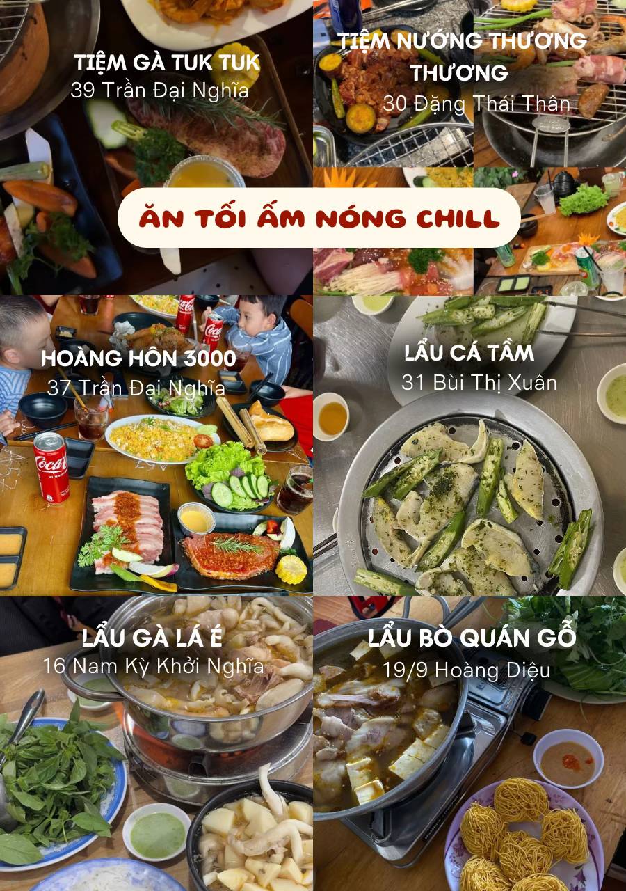👉 Có thể thử Lẩu Gà Lá É, Lẩu Bò Quán Gỗ hoặc Tiệm Nướng Thương Thương.